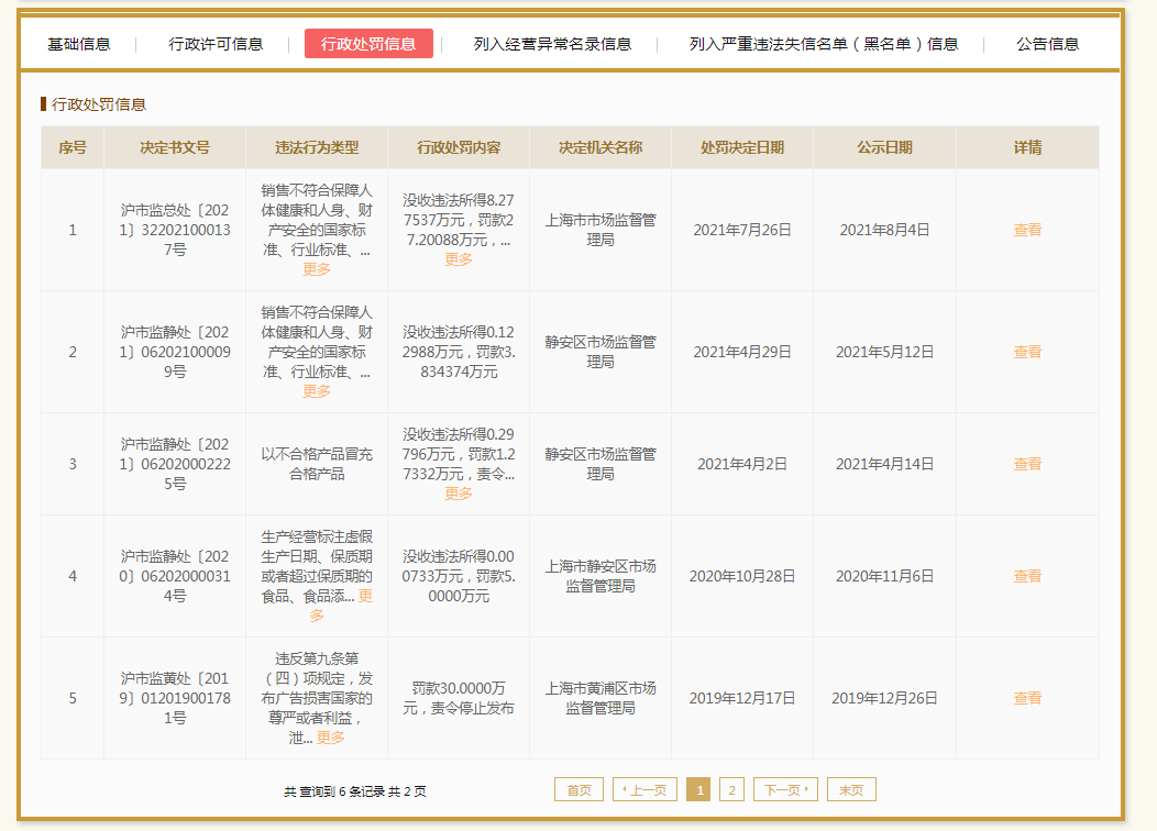此外,根據(jù)國(guó)家企業(yè)信用信息公示系統(tǒng)數(shù)據(jù),無(wú)印良品(上海)商業(yè)有限公司自2019年以來(lái)因各種違法違規(guī)被市場(chǎng)監(jiān)管部門(mén)處罰有6次。