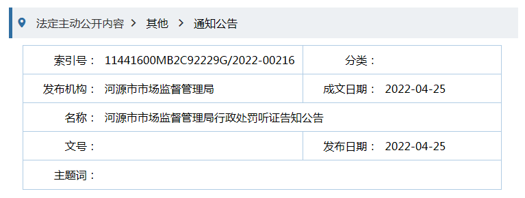 中國質量新聞網訊 4月25日,廣東省河源市市場監(jiān)督管理局發(fā)布行政處罰聽證告知公告。