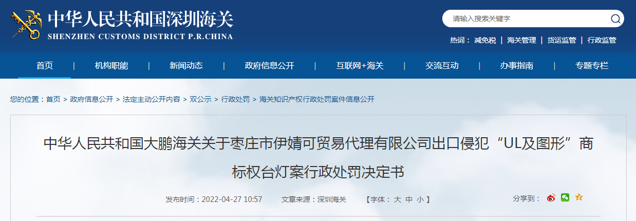 關于棗莊市伊婧可貿易代理有限公司出口侵犯“UL及圖形”商標權臺燈案行政處罰決定書