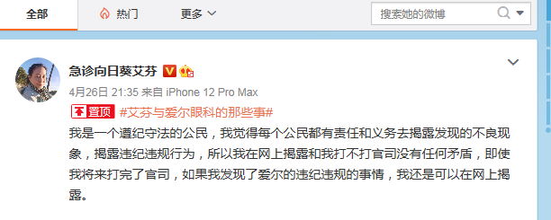 中國質(zhì)量新聞網(wǎng)注意到,4月26日晚上,武漢市中心醫(yī)院急診科主任艾芬在其個人微博上表示,每個公民都有責任和義務(wù)去揭露發(fā)現(xiàn)的不良現(xiàn)象,揭露違紀違規(guī)行為,所以她本人在網(wǎng)上揭露和打不打官司沒有任何矛盾,即使將來打完了官司,如果她發(fā)現(xiàn)了愛爾的違紀違規(guī)的事情還是可以在網(wǎng)上揭露。