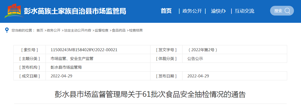 | 42 | / | / | 彭水縣佳惠商貿有限責任公司兩江廣場店 | 重慶 | 雞郡 | 散裝稱重 | 2022-03-15 |