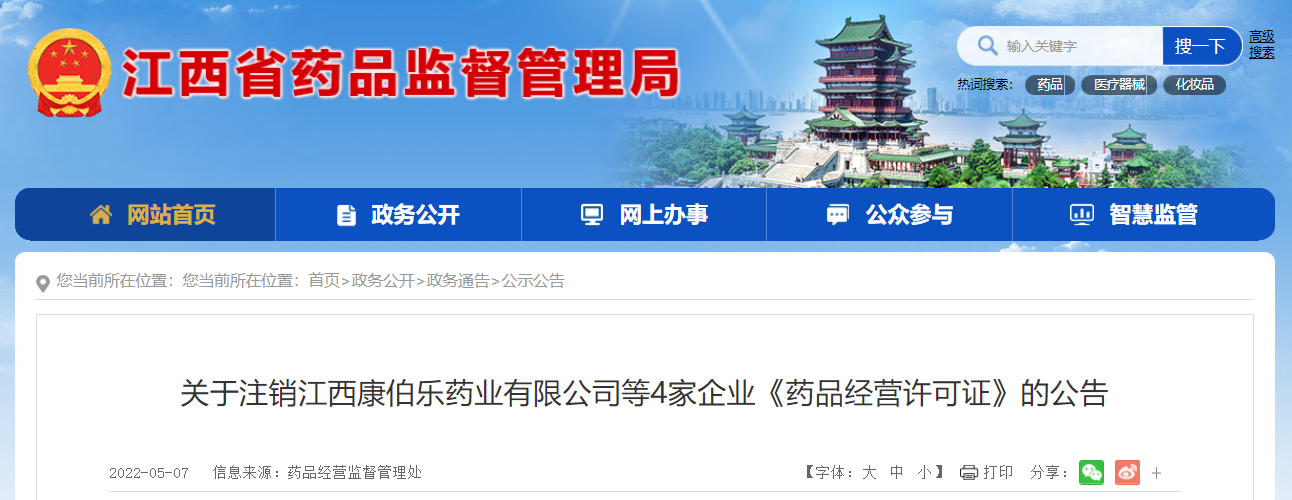 中國質(zhì)量新聞網(wǎng)訊 5月7日,江西省藥品監(jiān)督管理局網(wǎng)站發(fā)布關于注銷江西康伯樂藥業(yè)有限公司等4家企業(yè)《藥品經(jīng)營許可證》的公告。