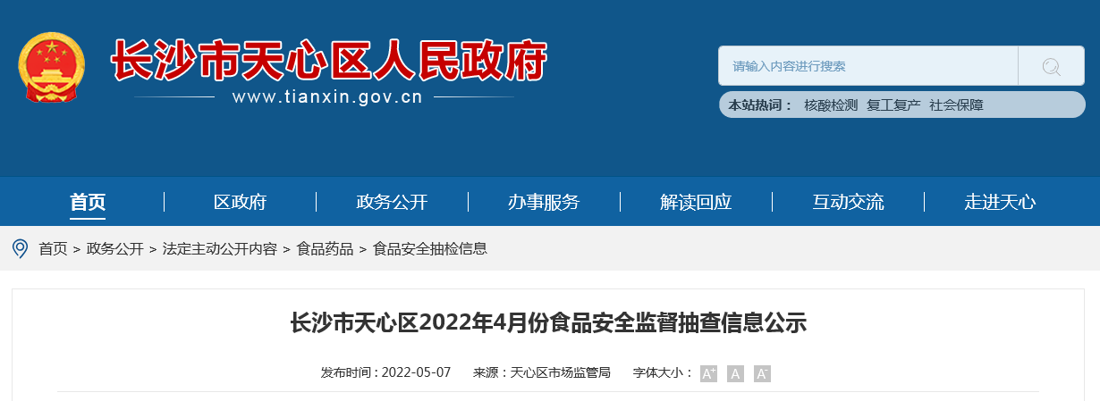中國(guó)質(zhì)量新聞網(wǎng)訊 5月7日,長(zhǎng)沙市天心區(qū)市場(chǎng)監(jiān)管局公示2022年4月份食品安全監(jiān)督抽查信息。