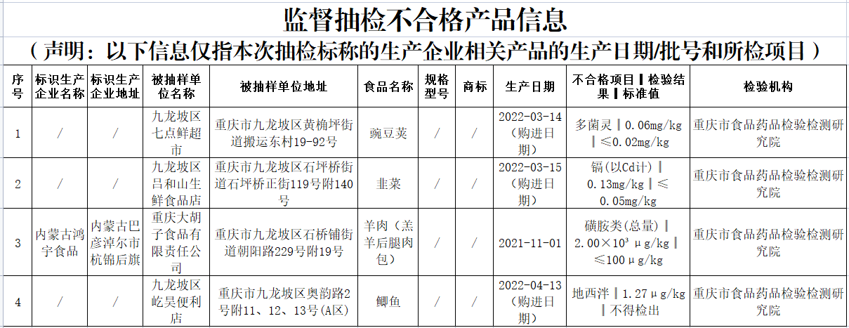 中國質(zhì)量新聞網(wǎng)訊 5月10日,重慶市九龍坡區(qū)市場監(jiān)督管理局網(wǎng)站發(fā)布通告(2022年第13號),近期,該局組織抽檢餐飲食品、茶葉及相關(guān)制品、炒貨食品及堅果制品、蛋制品、淀粉及淀粉制品、調(diào)味品、豆制品、食用農(nóng)產(chǎn)品、蔬菜制品、速凍食品、飲料、薯類和膨化食品等19類食品98批次樣品。其中抽樣檢驗項目合格樣品94批次,不合格樣品4批次。根據(jù)食品安全國家標準,個別項目不合格,其產(chǎn)品即判定為不合格產(chǎn)品。