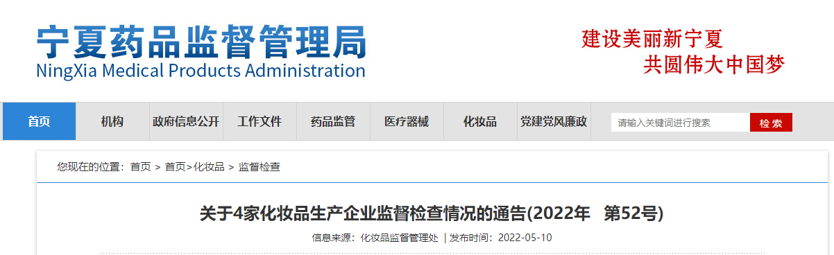 中國質(zhì)量新聞網(wǎng)訊 5月10日,寧夏回族自治區(qū)藥品監(jiān)督管理局網(wǎng)站發(fā)布關(guān)于4家化妝品生產(chǎn)企業(yè)監(jiān)督檢查情況的通告(2022年 第52號)。