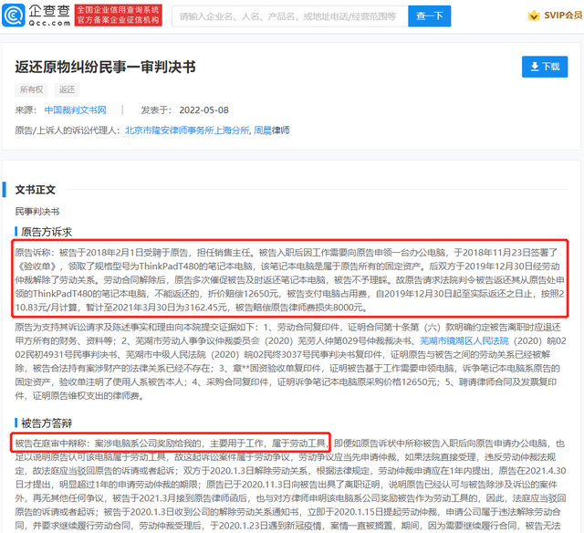 最終,法院判決,章某某返還維他奶(上海)有限公司ThinkPadT480筆記本電腦一臺。