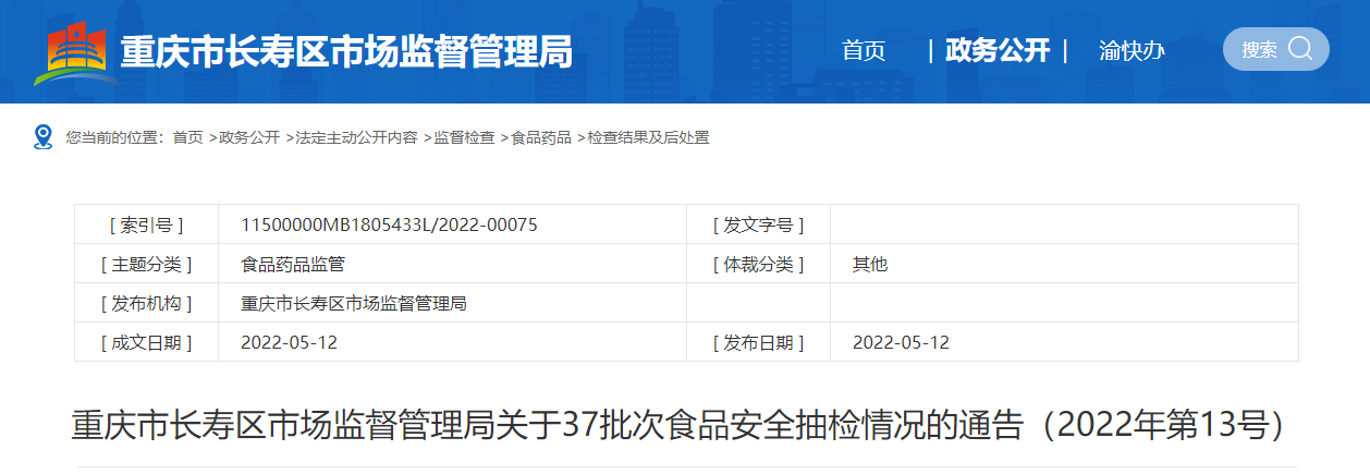 中國質(zhì)量新聞網(wǎng)訊 5月12日,重慶市長壽區(qū)市場監(jiān)管局網(wǎng)站發(fā)布關(guān)于37批次食品安全抽檢情況的通告(2022年第13號)。通告稱,近期,該局組織抽檢食用農(nóng)產(chǎn)品37批次樣品。抽樣檢驗(yàn)項(xiàng)目合格樣品35批次,不合格樣品2批次。根據(jù)食品安全國家標(biāo)準(zhǔn),個(gè)別項(xiàng)目不合格,其產(chǎn)品即判定為不合格產(chǎn)品。
