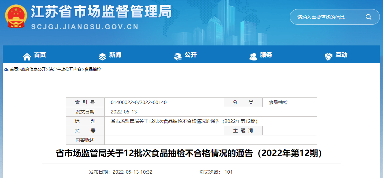 中國(guó)質(zhì)量新聞網(wǎng)訊 5月13日,江蘇省市場(chǎng)監(jiān)管局網(wǎng)站發(fā)布關(guān)于12批次食品抽檢不合格情況的通告(2022年第12期)。通告稱,近期,該局完成省級(jí)食品安全監(jiān)督抽檢任務(wù)543批次,涉及調(diào)味品、方便食品、冷凍飲品、餐飲食品、糕點(diǎn)、炒貨食品及堅(jiān)果制品、蔬菜制品、水果制品、特殊醫(yī)學(xué)用途配方食品和食用農(nóng)產(chǎn)品等。根據(jù)食品安全國(guó)家標(biāo)準(zhǔn)檢驗(yàn)和判定,其中抽樣檢驗(yàn)項(xiàng)目合格樣品531批次、不合格樣品12批次,具體情況如下: