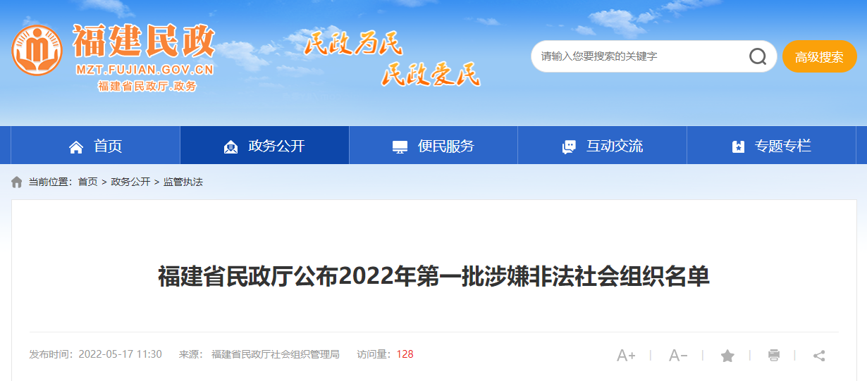 中國(guó)質(zhì)量新聞網(wǎng)訊 據(jù)福建省民政廳網(wǎng)站消息,為進(jìn)一步加大對(duì)非法社會(huì)組織的打擊整治力度,充分發(fā)揮社會(huì)監(jiān)督作用,現(xiàn)公布2022年第一批涉嫌非法社會(huì)組織名單,請(qǐng)社會(huì)公眾提高警惕,避免受騙上當(dāng)。未在民政部門登記的涉嫌非法社會(huì)組織名單: