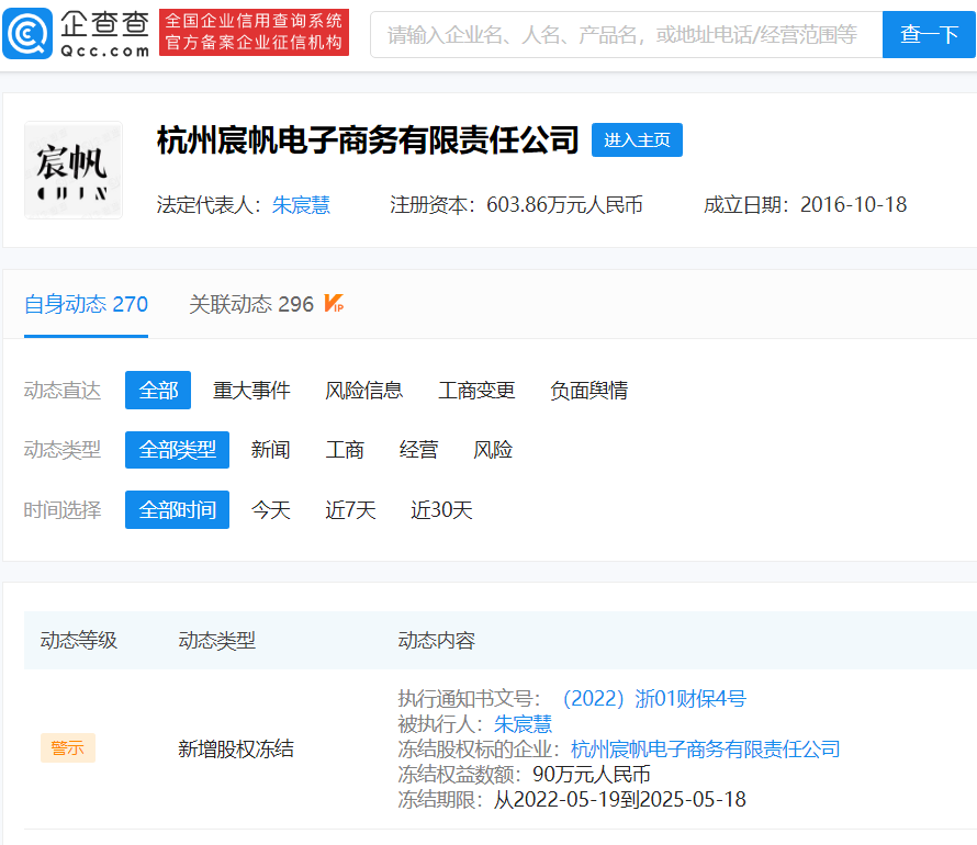 中國(guó)質(zhì)量新聞網(wǎng)訊(閆冬) 近日,杭州宸帆電子商務(wù)有限責(zé)任公司新增股權(quán)凍結(jié)信息,被執(zhí)行人為朱宸慧(雪梨),凍結(jié)權(quán)益數(shù)額90萬(wàn)元人民幣。