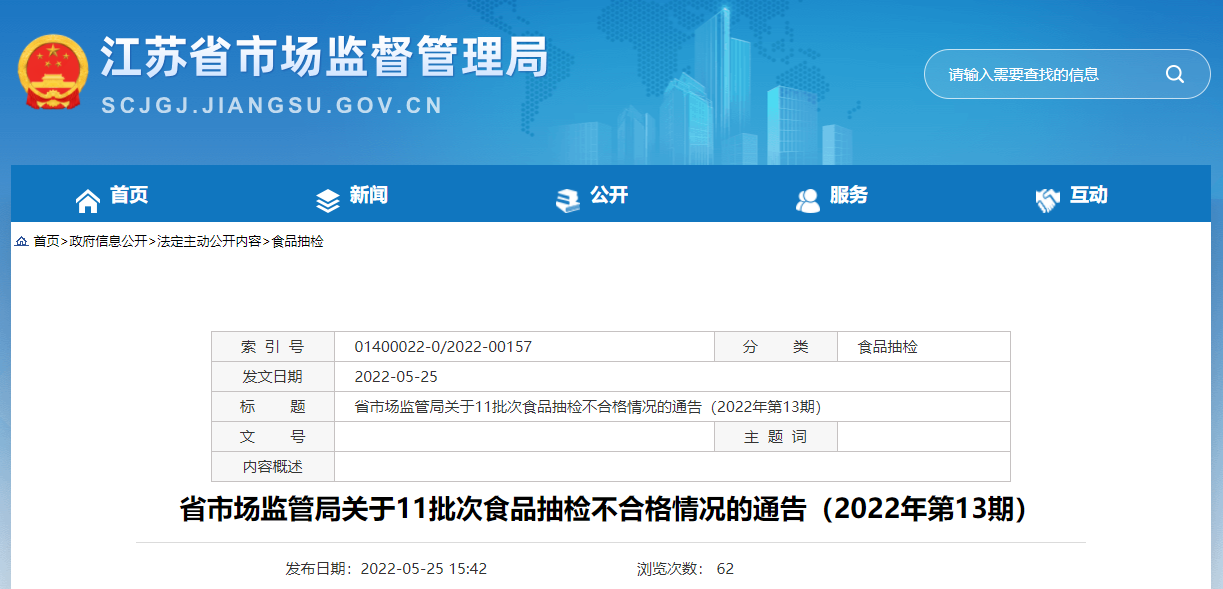 中國質(zhì)量新聞網(wǎng)訊 5月25日,江蘇省市場監(jiān)管局網(wǎng)站發(fā)布關(guān)于11批次食品抽檢不合格情況的通告(2022年第13期)。通告稱,近期,該局完成省級食品安全監(jiān)督抽檢任務(wù)547批次,涉及餐飲食品、糕點(diǎn)、炒貨食品及堅(jiān)果制品、蜂產(chǎn)品、餅干、罐頭、酒類、豆制品、食糖、保健食品和食用農(nóng)產(chǎn)品等。根據(jù)食品安全國家標(biāo)準(zhǔn)檢驗(yàn)和判定,其中抽樣檢驗(yàn)項(xiàng)目合格樣品536批次、不合格樣品11批次,具體情況如下: