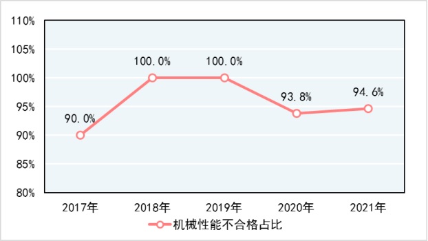 從企業(yè)規(guī)模看,近5年防爆電氣產(chǎn)品大、中、小微型企業(yè)抽查不合格率分別為9.5%、7.4%、31.0%,產(chǎn)品質(zhì)量狀況差距明顯。從檢驗項目來看,2021年抽查中,機械性能是防爆電氣產(chǎn)品主要的不合格指標,該指標不合格批次占不合格產(chǎn)品總批次的94.6%。
