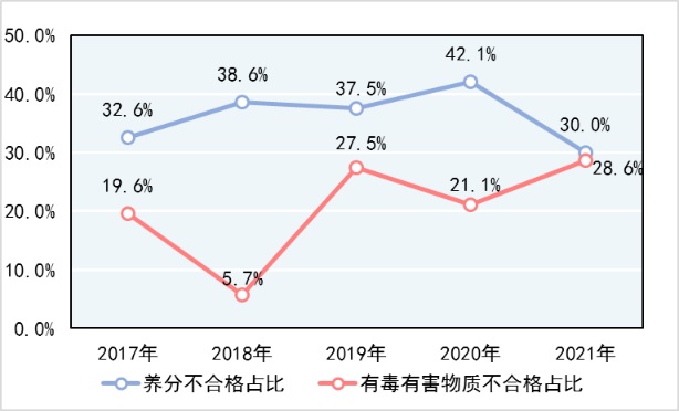 養(yǎng)分和有毒有害物質(zhì)指標是化肥產(chǎn)品的主要不合格指標。養(yǎng)分指標不合格批次占不合格產(chǎn)品總批次的30.0%,有毒有害物質(zhì)指標不合格批次占不合格產(chǎn)品總批次的28.6%。