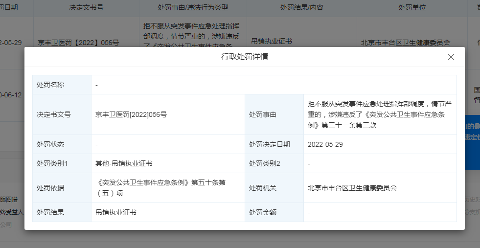 天眼查信息顯示,北京中同藍(lán)博醫(yī)學(xué)檢驗(yàn)實(shí)驗(yàn)室因拒不服從突發(fā)事件應(yīng)急處理指揮部調(diào)度,情節(jié)嚴(yán)重,涉嫌違反了《突發(fā)公共衛(wèi)生事件應(yīng)急條例》第三十一條第三款,被北京市豐臺(tái)區(qū)衛(wèi)生健康委員會(huì)吊銷(xiāo)執(zhí)業(yè)證書(shū)。處罰日期為2022年5月29日。