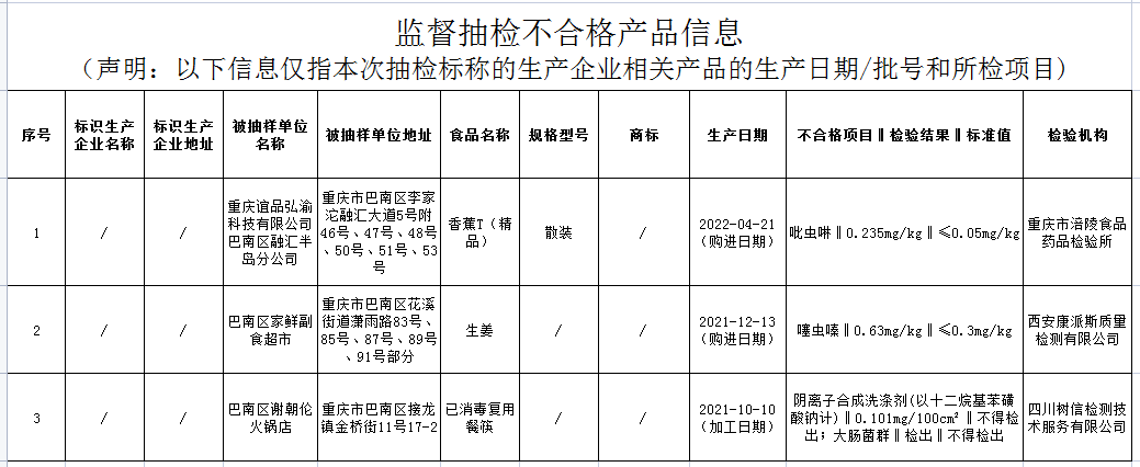 中國(guó)質(zhì)量新聞網(wǎng)訊 6月10日,重慶市巴南區(qū)市場(chǎng)監(jiān)督管理局發(fā)布關(guān)于105批次食品安全抽檢情況的通告(2022年第9號(hào))。通告稱,近期,該局組織抽檢餐飲食品、食用農(nóng)產(chǎn)品等105批次樣品,抽樣檢驗(yàn)項(xiàng)目合格樣品102批次,不合格樣品3批次。根據(jù)食品安全國(guó)家標(biāo)準(zhǔn),個(gè)別項(xiàng)目不合格,其產(chǎn)品即判定為不合格產(chǎn)品。
