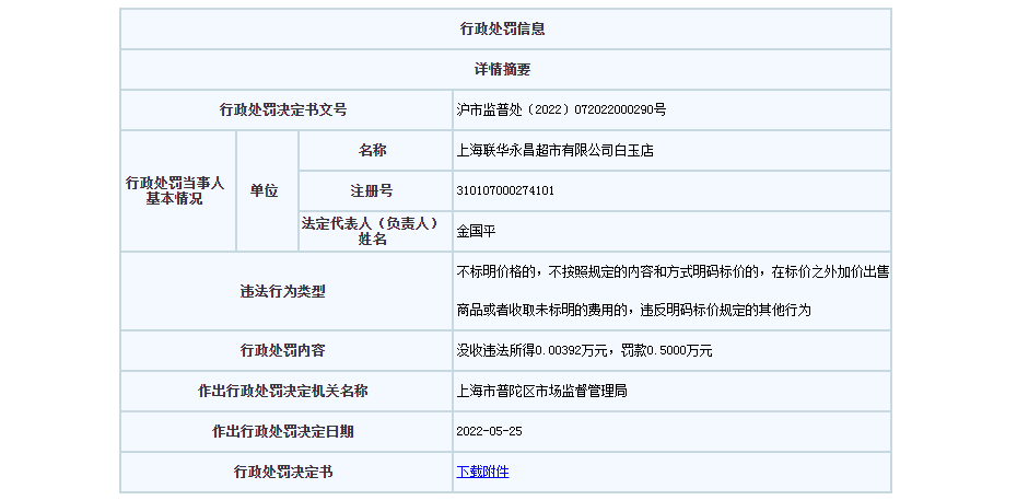 行政處罰信息顯示,經(jīng)查明,上海聯(lián)華永昌超市有限公司白玉店于2022年3月9日至2022年3月31日期間,在其經(jīng)營(yíng)場(chǎng)所以明碼標(biāo)價(jià)4.40元/袋對(duì)外銷售“烏江牌全型榨菜塊300G”,但當(dāng)事人實(shí)際以5.80元/袋進(jìn)行商品結(jié)算。