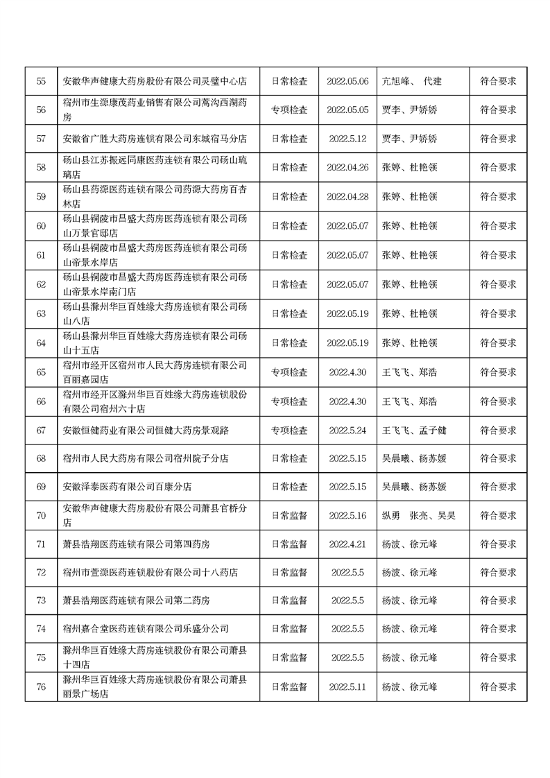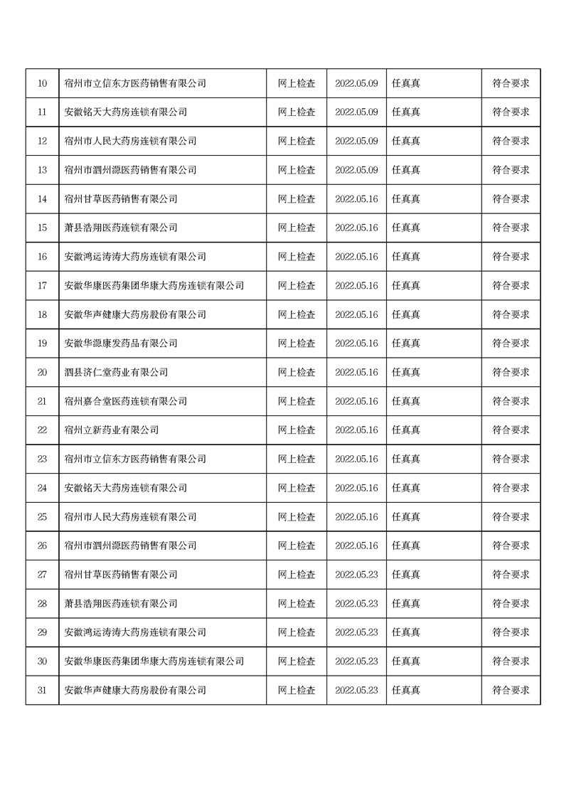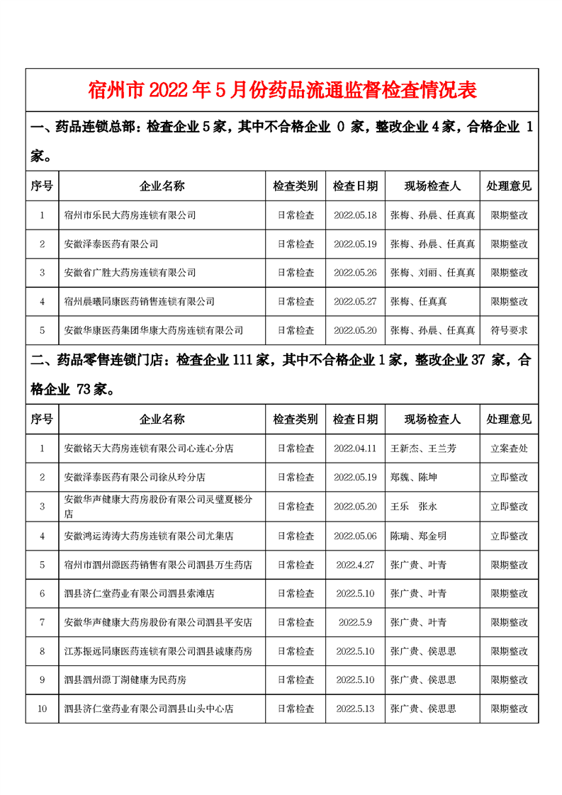 中國質(zhì)量新聞網(wǎng)訊 6月15日,安徽省宿州市市場監(jiān)管局網(wǎng)站發(fā)布2022年5月份藥品流通監(jiān)督檢查情況表。
