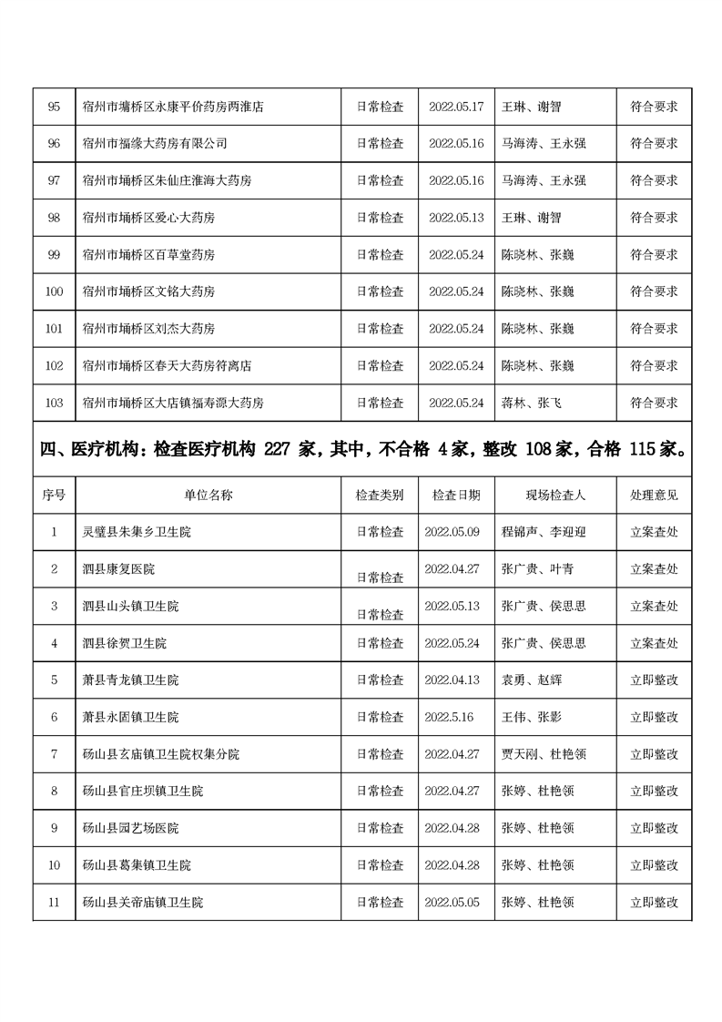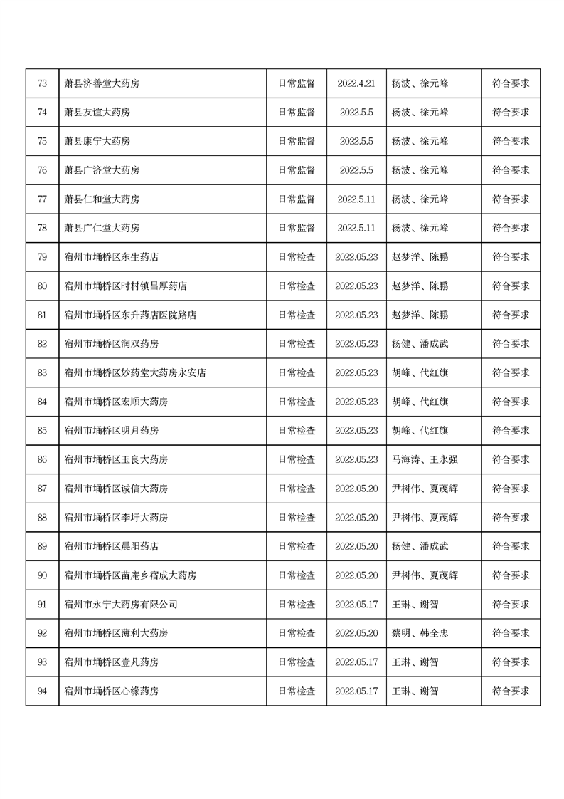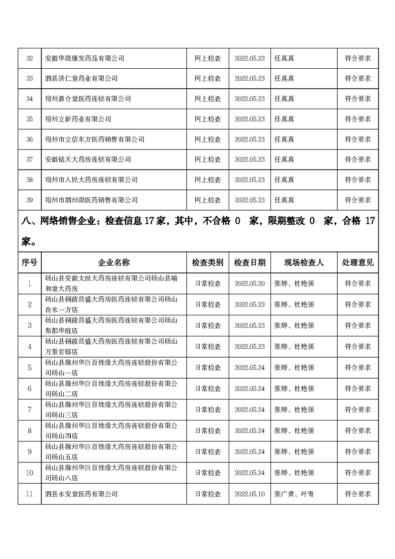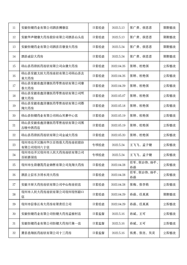 中國質(zhì)量新聞網(wǎng)訊 6月15日,安徽省宿州市市場監(jiān)管局網(wǎng)站發(fā)布2022年5月份藥品流通監(jiān)督檢查情況表。