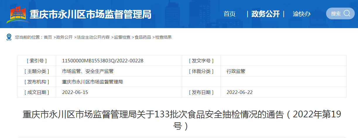 中國質(zhì)量新聞網(wǎng)訊 6月22日,重慶市永川區(qū)市場監(jiān)督管理局網(wǎng)站發(fā)布關(guān)于133批次食品安全抽檢情況的通告(2022年第19號)。通告稱,近期,該局組織抽檢食用農(nóng)產(chǎn)品133批次樣品。抽樣檢驗項目合格樣品131批次,不合格樣品2批次。根據(jù)食品安全國家標準,個別項目不合格,其產(chǎn)品即判定為不合格產(chǎn)品。