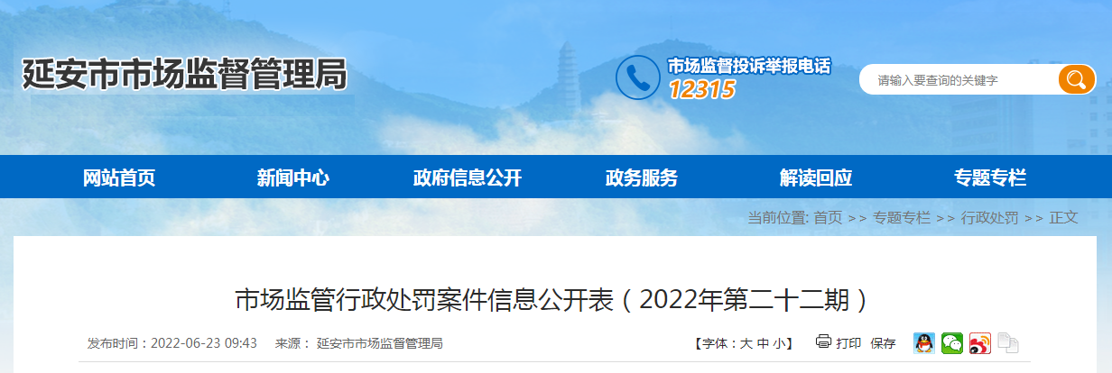 中國(guó)質(zhì)量新聞網(wǎng)訊 6月23日,陜西省延安市市場(chǎng)監(jiān)管局網(wǎng)站公開2022年第二十二期行政處罰案件信息。