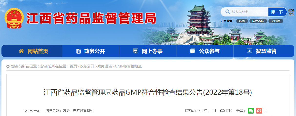 中國質(zhì)量新聞網(wǎng)訊 6月28日,江西省藥品監(jiān)督管理局網(wǎng)站發(fā)布藥品GMP符合性檢查結(jié)果公告(2022年第18號)。