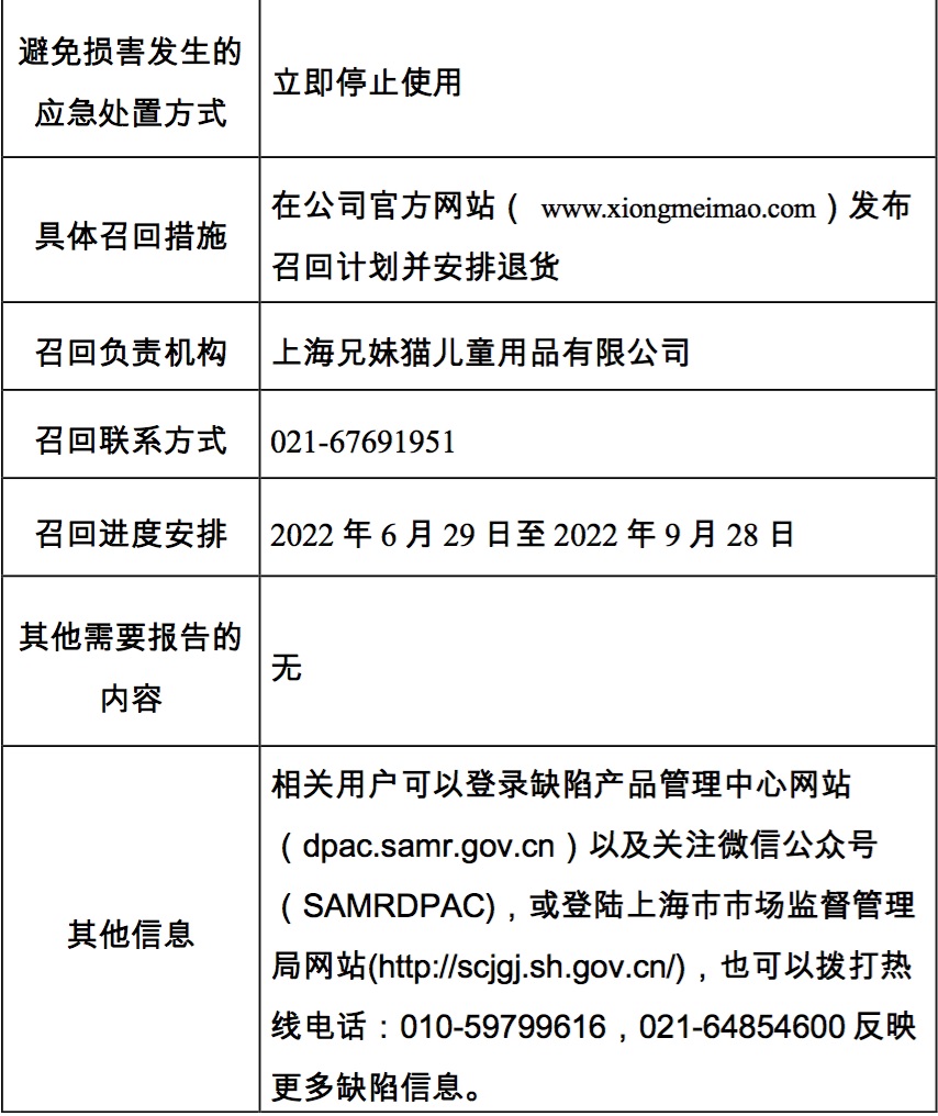請消費者立即停止使用該產(chǎn)品,上海兄妹貓兒童用品有限公司將在官方網(wǎng)站(www.xiongmeimao.com)發(fā)布召回計劃并安排退貨。