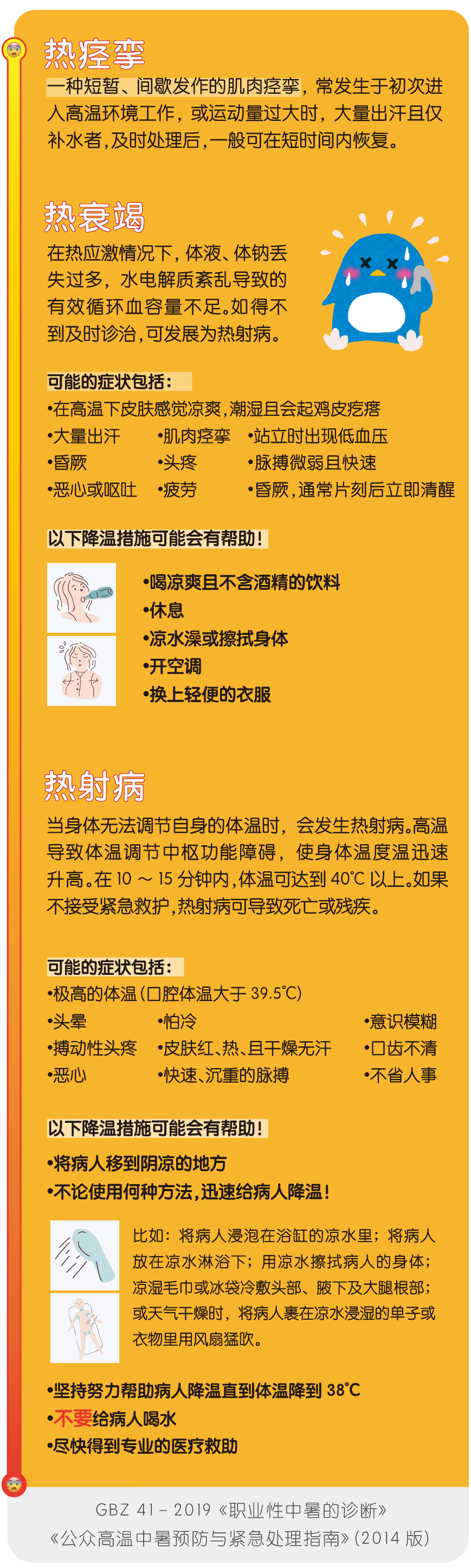 中暑初期會(huì)出現(xiàn)頭痛、頭暈、心悸,體溫升高等癥狀,國(guó)家職業(yè)衛(wèi)生標(biāo)準(zhǔn)GBZ 41—2019《職業(yè)性中暑的診斷》中將中暑分成三類:熱痙攣、熱衰竭、熱射病??。