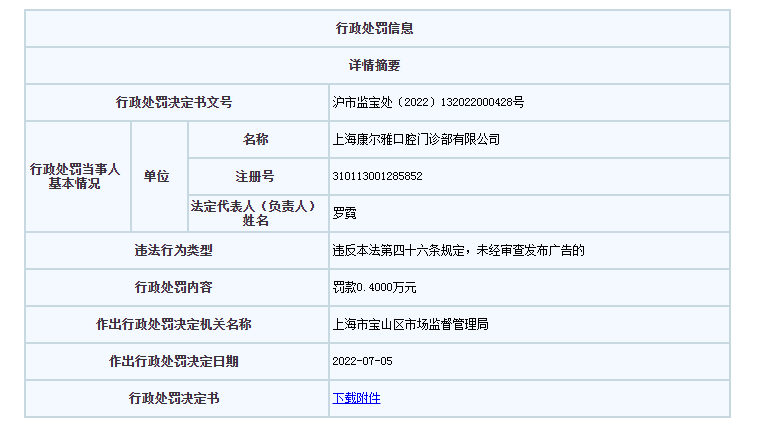 中國(guó)質(zhì)量新聞網(wǎng)訊(閆冬)近日,上海市市場(chǎng)監(jiān)督管理局公布一則行政處罰信息。上??禒栄趴谇婚T(mén)診部有限公司(以下簡(jiǎn)稱(chēng):當(dāng)事人)因違反廣告法被市場(chǎng)監(jiān)管部門(mén)罰款4000元。