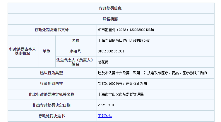 滬市監(jiān)寶處〔2022〕132022000423號(hào)顯示,2022年2月26日,上海市寶山區(qū)市場(chǎng)監(jiān)督管理局接舉報(bào)反映上海尤旦盛菊口腔門診部有限公司在官網(wǎng)上使用的廣告用語(yǔ)涉嫌違法,上海市寶山區(qū)市場(chǎng)監(jiān)督管理局執(zhí)法人員對(duì)上述網(wǎng)絡(luò)頁(yè)面進(jìn)行檢查,發(fā)現(xiàn)情況屬實(shí)。