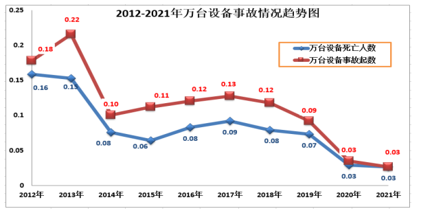2012年以來萬臺(tái)特種設(shè)備事故情況趨勢及2021年全省特種設(shè)備事故分類統(tǒng)計(jì)情況見下圖: