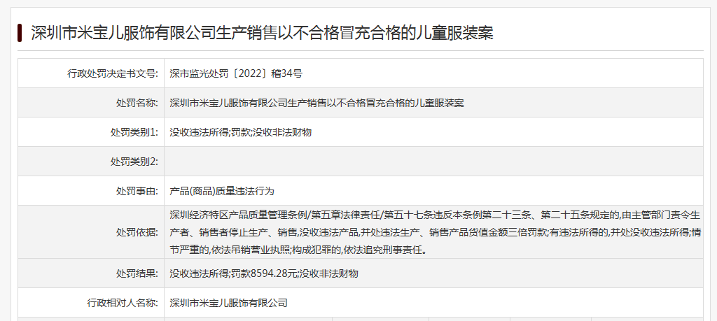 中國質(zhì)量新聞網(wǎng)訊(閆冬)近日,深圳市市場監(jiān)督管理局公布一則行政處罰決定書。深圳市米寶兒服飾有限公司因生產(chǎn)銷售以不合格冒充合格的兒童服裝被市場監(jiān)管部門處罰。