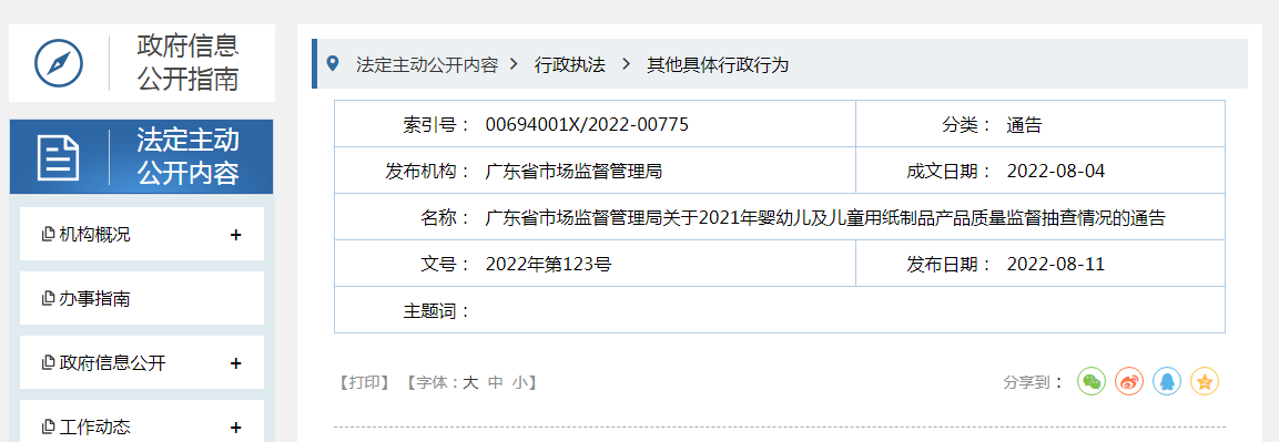 廣東省市場(chǎng)監(jiān)督管理局關(guān)于2021年嬰幼兒及兒童用紙制品產(chǎn)品質(zhì)量監(jiān)督抽查情況的通告