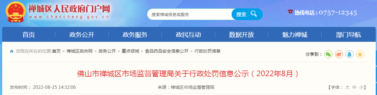 中國(guó)質(zhì)量新聞網(wǎng)訊 近日,廣東省佛山市禪城區(qū)市場(chǎng)監(jiān)管局公示行政處罰信息(2022年8月)。