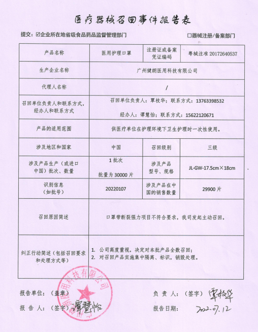 廣州健朗醫(yī)用科技有限公司對其生產(chǎn)的醫(yī)用護理口罩(注冊證號:粵械注準(zhǔn)20172640537)生產(chǎn)批號為20220107主動召回。召回級別為三級。涉及產(chǎn)品的型號、規(guī)格及批次等詳細信息見《醫(yī)療器械召回事件報告表》。