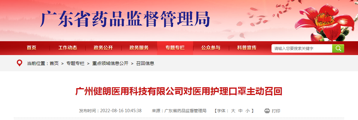 中國質(zhì)量新聞網(wǎng)訊 據(jù)廣東省藥監(jiān)局網(wǎng)站8月16日消息,廣州健朗醫(yī)用科技有限公司生產(chǎn)的醫(yī)用護理口罩,生產(chǎn)批號為20220107,經(jīng)檢查發(fā)現(xiàn)口罩帶斷裂強力項目不符合要求,廣州健朗醫(yī)用科技有限公司決定發(fā)起主動召回。