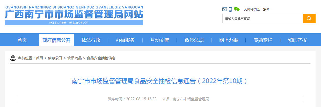 中國質(zhì)量新聞網(wǎng)訊 8月15日,南寧市市場(chǎng)監(jiān)督管理局網(wǎng)站發(fā)布食品安全抽檢信息通告(2022年第10期)。本期抽檢糧食加工品、酒類、豆制品、蔬菜制品、水果制品、炒貨食品及堅(jiān)果制品、淀粉及淀粉制品、糕點(diǎn)、食糖和食用農(nóng)產(chǎn)品等20個(gè)食品大類660批次,其中合格648批次,不合格12批次。