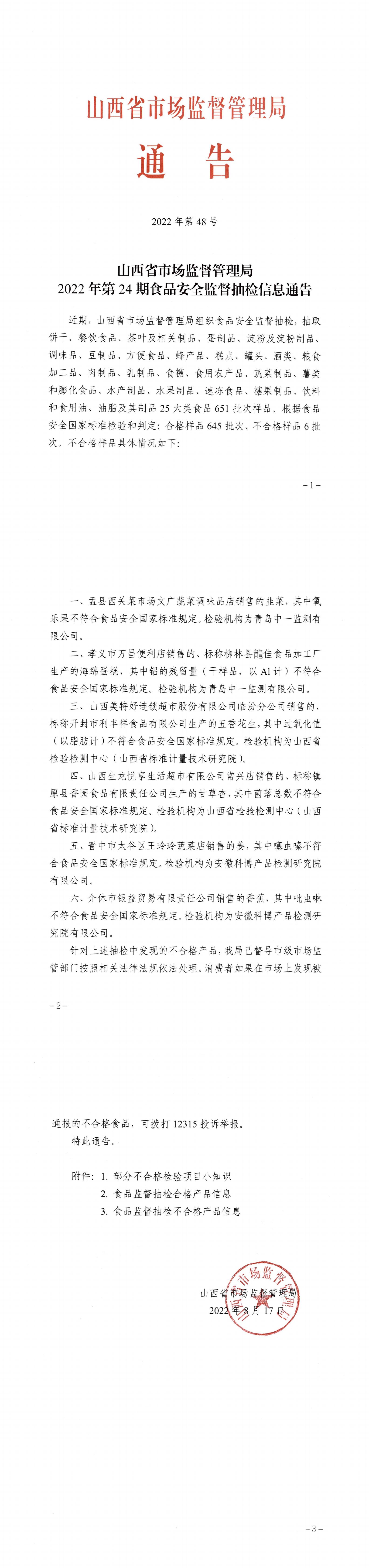 中國質(zhì)量新聞網(wǎng)訊 近日,山西省市場監(jiān)管局發(fā)布2022年第24期食品安全監(jiān)督抽檢信息的通告。本期抽檢25大類食品651批次樣品,其中合格樣品645批次,不合格樣品6批次。