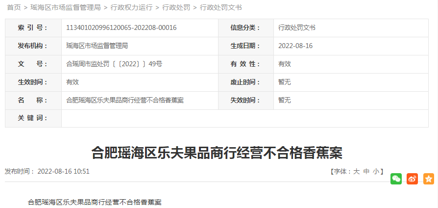 合肥瑤海區(qū)樂夫果品商行經(jīng)營不合格香蕉案