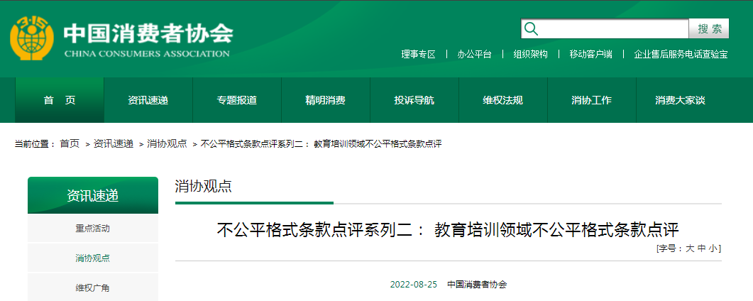 根據(jù)《“不公平格式條款”消費者認(rèn)知及線索征集調(diào)查報告》,中國消費者協(xié)會邀請中消協(xié)律師團律師對消費者反映強烈的教育培訓(xùn)領(lǐng)域不公平格式條款進行點評。具體如下: