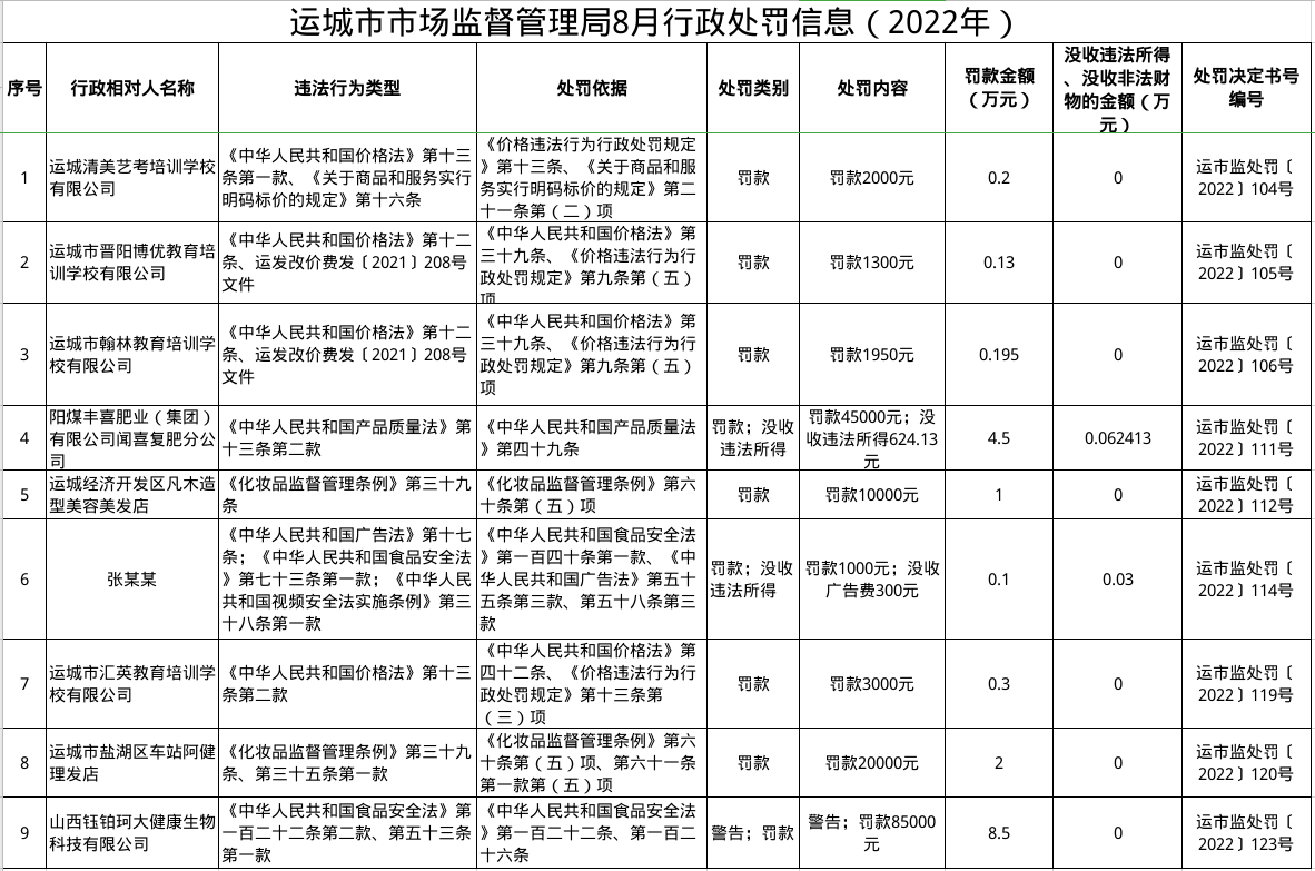 中國質(zhì)量新聞網(wǎng)訊 近日,山西省運(yùn)城市市場監(jiān)督管理局發(fā)布8月行政處罰信息(2022年)。