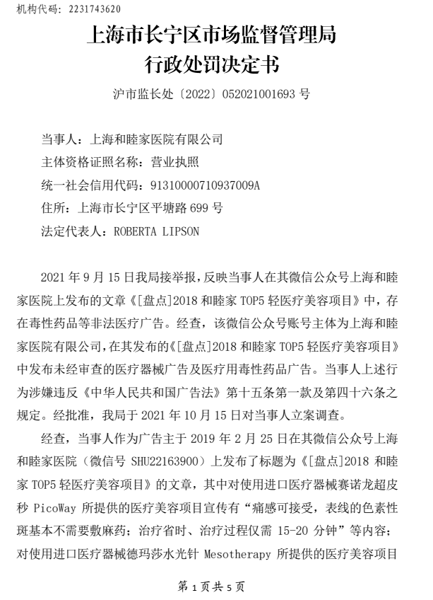 滬市監(jiān)普處〔2022〕072022000238號處罰文書顯示,2021年9月15日上海市長寧區(qū)市場監(jiān)督管理局接舉報,反映當事人在其微信公眾號上海和睦家醫(yī)院上發(fā)布的文章《[盤點]2018 和睦家 TOP5 輕醫(yī)療美容項目》中,存在毒性藥品等非法醫(yī)療廣告。經查,該微信公眾號賬號主體為上海和睦家醫(yī)院有限公司,在其發(fā)布的《[盤點]2018 和睦家 TOP5 輕醫(yī)療美容項目》中發(fā)布未經審查的醫(yī)療器械廣告及醫(yī)療用毒性藥品廣告。當事人上述行為涉嫌違反《中華人民共和國廣告法》第十五條第一款及第四十六條之規(guī)定。經批準,上海市長寧區(qū)市場監(jiān)督管理局于2021年10月15日對當事人立案調查。