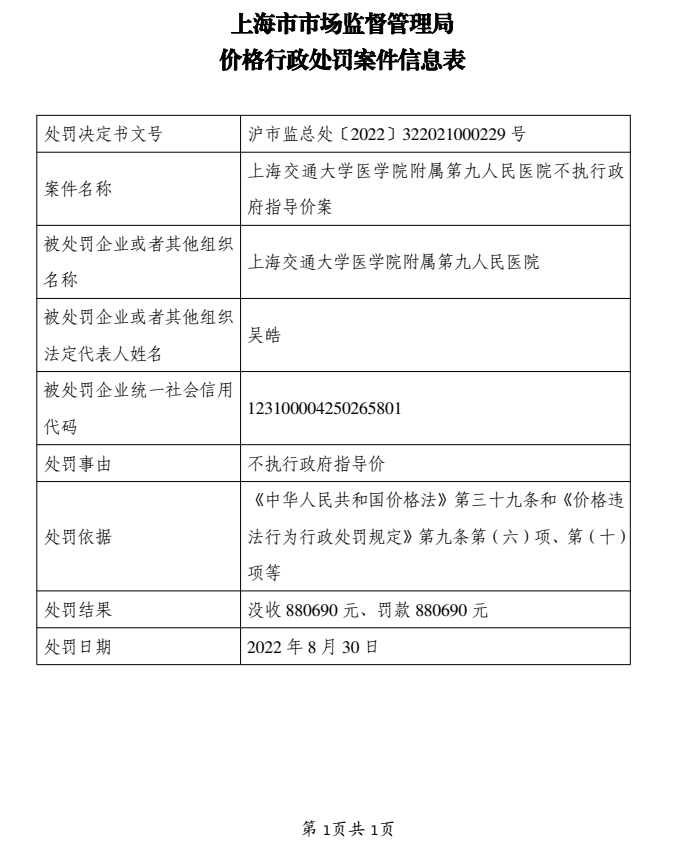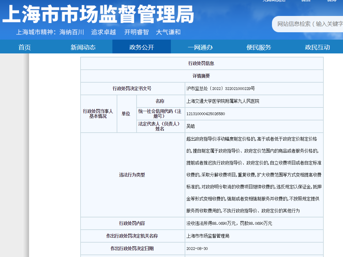 中國質(zhì)量新聞網(wǎng)訊 上海市市場監(jiān)督管理局官網(wǎng)發(fā)布的一則行政處罰信息顯示,近日,上海交通大學(xué)醫(yī)學(xué)院附屬第九人民醫(yī)院因不執(zhí)行政府指導(dǎo)價,被上海市市場監(jiān)督管理局罰款人民幣88.0690萬元并沒收違法所得88.0690萬元。