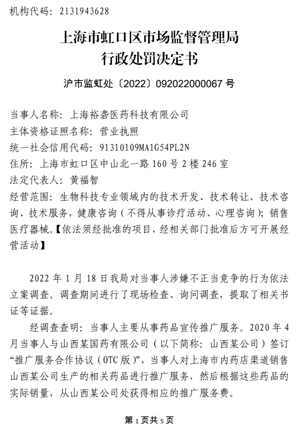 中國質(zhì)量新聞網(wǎng)訊 上海市市場監(jiān)督管理局官網(wǎng)發(fā)布的一則行政處罰信息顯示,近日,上海裕礱醫(yī)藥科技有限公司因不正當(dāng)競爭,被上海市虹口區(qū)市場監(jiān)督管理局罰款人民幣30萬元并沒收違法所得1.9萬多元。