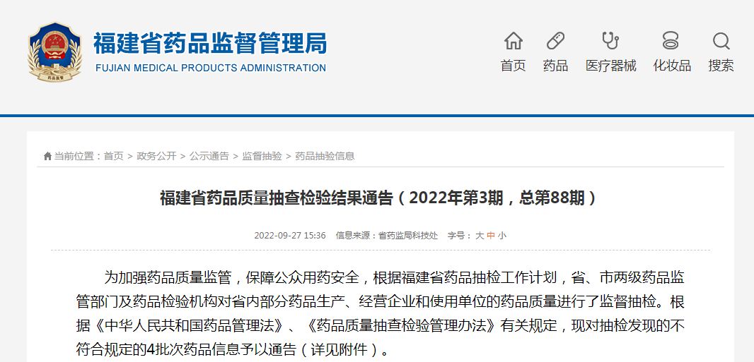 中國(guó)質(zhì)量新聞網(wǎng)訊 9月27日,福建省藥品監(jiān)督管理局網(wǎng)站發(fā)布藥品質(zhì)量抽查檢驗(yàn)結(jié)果通告(2022年第3期,總第88期)。通告稱,為加強(qiáng)藥品質(zhì)量監(jiān)管,保障公眾用藥安全,根據(jù)福建省藥品抽檢工作計(jì)劃,省、市兩級(jí)藥品監(jiān)管部門(mén)及藥品檢驗(yàn)機(jī)構(gòu)對(duì)省內(nèi)部分藥品生產(chǎn)、經(jīng)營(yíng)企業(yè)和使用單位的藥品質(zhì)量進(jìn)行了監(jiān)督抽檢。根據(jù)《中華人民共和國(guó)藥品管理法》、《藥品質(zhì)量抽查檢驗(yàn)管理辦法》有關(guān)規(guī)定,現(xiàn)對(duì)抽檢發(fā)現(xiàn)的不符合規(guī)定的4批次藥品信息予以公布。