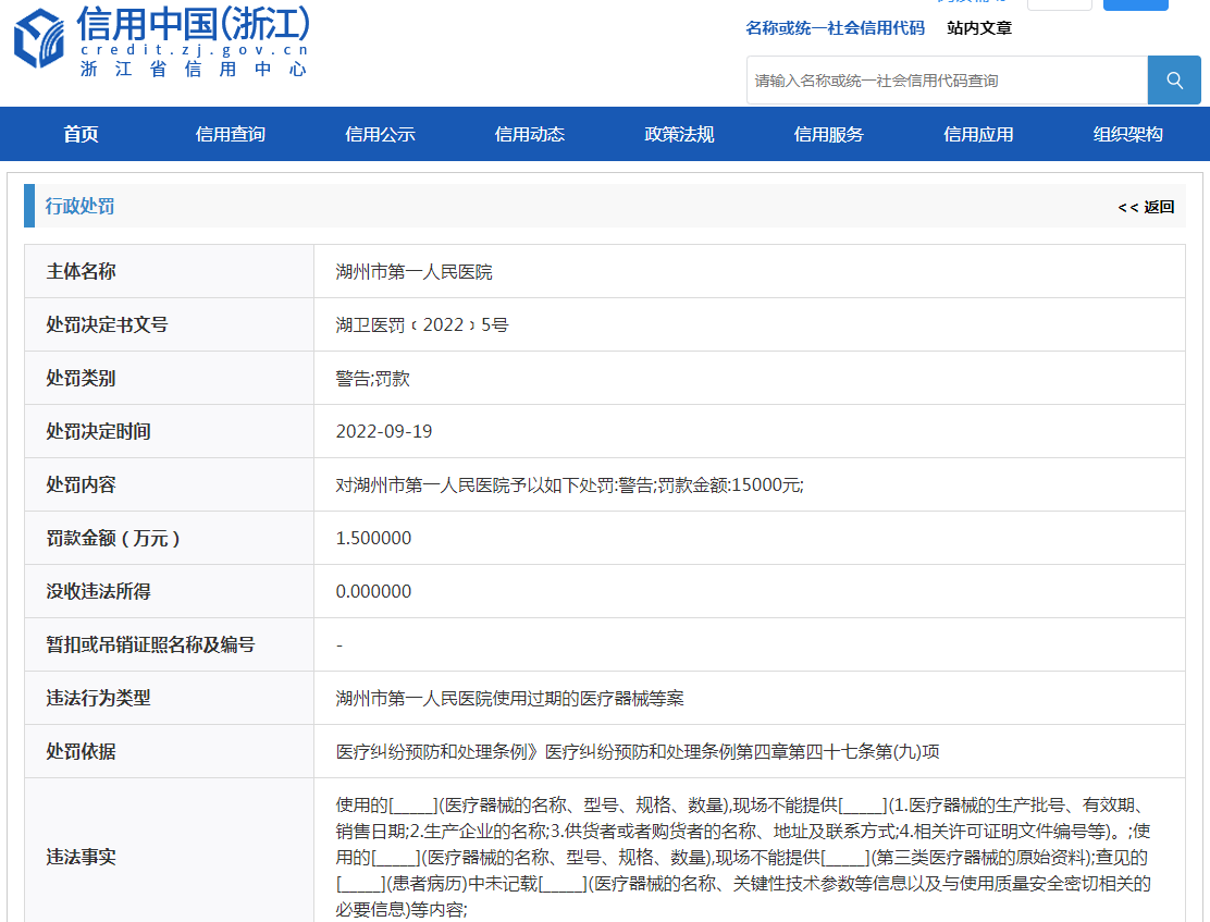 中國質(zhì)量新聞網(wǎng)訊 近日,信用中國(浙江)發(fā)布的一則行政處罰信息顯示,湖州市第一人民醫(yī)院因使用過期的醫(yī)療器械等違法行為,依據(jù)《醫(yī)療糾紛預(yù)防和處理條例》醫(yī)療糾紛預(yù)防和處理條例第四章第四十七條第(九)項相關(guān)規(guī)定,湖州市衛(wèi)生健康委員會對湖州市第一人民醫(yī)院予以如下處罰:警告;罰款金額:15000元。