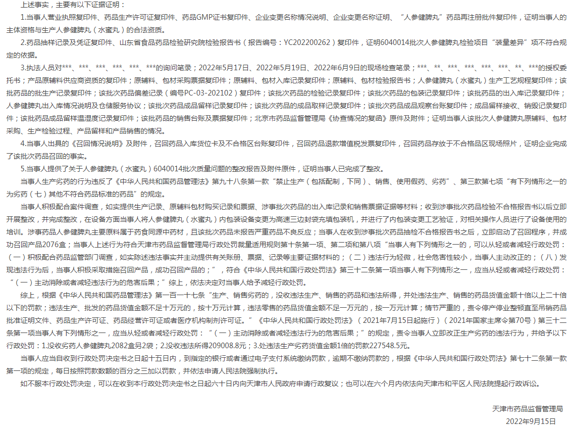 津藥監(jiān)(一辦)罰〔2022〕14號處罰文書顯示,天津市藥品監(jiān)督管理局收到山東省食品藥品檢驗研究院檢驗報告書(報告編號:YC202200262),該報告書顯示天津中新藥業(yè)集團股份有限公司達仁堂制藥廠生產(chǎn)的人參健脾丸(批號:6040014)標示檢驗項目“裝量差異”項不符合規(guī)定。津藥達仁堂集團股份有限公司達仁堂制藥廠于2022年6月24日進行了企業(yè)名稱變更,原企業(yè)名稱為天津中新藥業(yè)集團股份有限公司達仁堂制藥廠,當事人于2021年6月10日生產(chǎn)的人參健脾丸(批號:6040014,包裝規(guī)格:每盒8g/6袋,100盒/箱)156948袋,折合26158盒,成品留樣3盒,成品放行26155盒。當事人銷售了該批次藥品26100盒,企業(yè)召回了該批次產(chǎn)品2076盒,合計違法所得209008.8元,貨值金額共計227548.5元。生產(chǎn)劣藥的行為違反了《中華人民共和國藥品管理法》相關(guān)規(guī)定,藥監(jiān)部門責令當事人立即改正生產(chǎn)劣藥的違法行為,并給予以下行政處罰:1.沒收劣藥人參健脾丸2082盒另2袋;2.沒收違法所得209008.8元;3.處違法生產(chǎn)劣藥貨值金額1倍的罰款227548.5元。