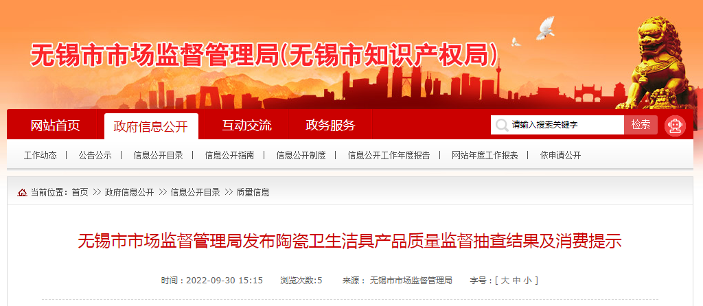 中國(guó)質(zhì)量新聞網(wǎng)訊 據(jù)江蘇省無(wú)錫市市場(chǎng)監(jiān)管局網(wǎng)站消息,2022年度,無(wú)錫市市場(chǎng)監(jiān)督管理局對(duì)陶瓷衛(wèi)生潔具產(chǎn)品質(zhì)量進(jìn)行了監(jiān)督抽查。共抽查產(chǎn)品30批次,不合格產(chǎn)品1批次,不合格發(fā)現(xiàn)率3.33%。