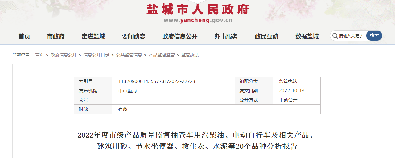 中國(guó)質(zhì)量新聞網(wǎng)訊 近日,江蘇省鹽城市市場(chǎng)監(jiān)管局發(fā)布2022年度市級(jí)產(chǎn)品質(zhì)量監(jiān)督抽查車用汽柴油、電動(dòng)自行車及相關(guān)產(chǎn)品、建筑用砂、節(jié)水坐便器、救生衣、水泥等20個(gè)品種分析報(bào)告。