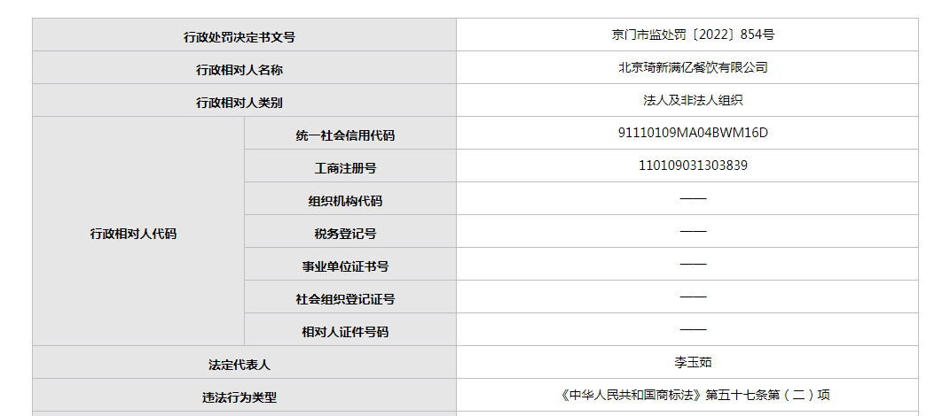 京門市監(jiān)處罰〔2022〕854號(hào)顯示,2022年8月16日,北京市門頭溝區(qū)市場(chǎng)監(jiān)督管理局接到上海馥邑企業(yè)管理有限公司的投訴稱,北京琦新滿億餐飲有限公司在北京市門頭溝區(qū)金沙西街17號(hào)院3號(hào)樓1層104室從事自制飲品制售經(jīng)營活動(dòng)中,侵犯其注冊(cè)商標(biāo)專用權(quán),請(qǐng)求查處。