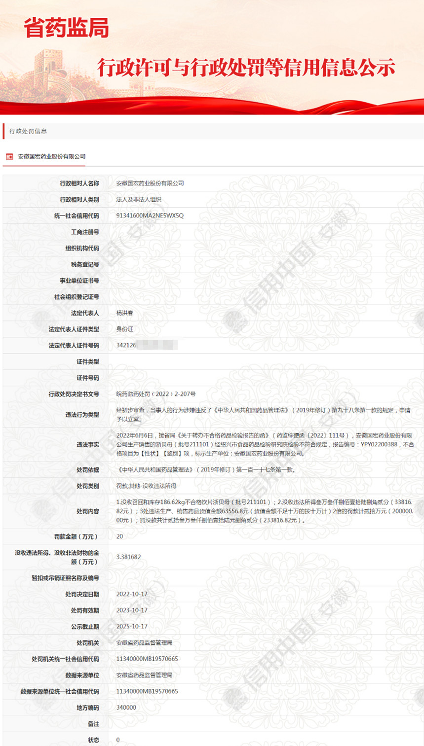 皖藥監(jiān)藥處罰﹝2022﹞2-207號(hào)處罰文書(shū)顯示,安徽國(guó)宏藥業(yè)股份有限公司生產(chǎn)銷售的浙貝母(批號(hào)211101)經(jīng)紹興市食品藥品檢驗(yàn)研究院檢驗(yàn)不符合規(guī)定,不合格項(xiàng)目為【性狀】【鑒別】項(xiàng),標(biāo)示生產(chǎn)單位:安徽國(guó)宏藥業(yè)股份有限公司。